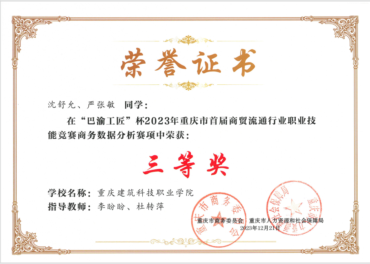 图4:巴渝工匠杯职业技能竞赛商务数据分析赛项中斩获三等奖