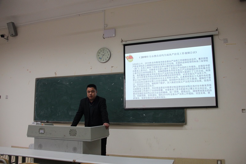 3月13日下午13:30,房地产商学院党总支在3408教室召开党员大会。此次会议专题学习了《全市教育系统全面从严治党视频工作会》、《中国教育现代化2035》、《加快推进教育现代化实施方案(2018-2022年)》、《国家职业教育改革实施方案》和《重庆市高等教育发展计划》五个重要文件。会议由党总支书记孙佳主持。