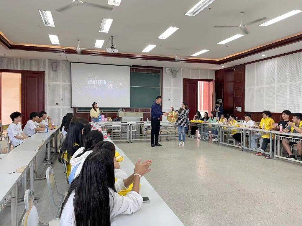 见面会一开始由教研室主任郝海彤老师敲响了代表正式开班的锣,本着专业特征,老师们借用了公司上市的敲钟仪式来祝福同学们在新学期有美好的开始。