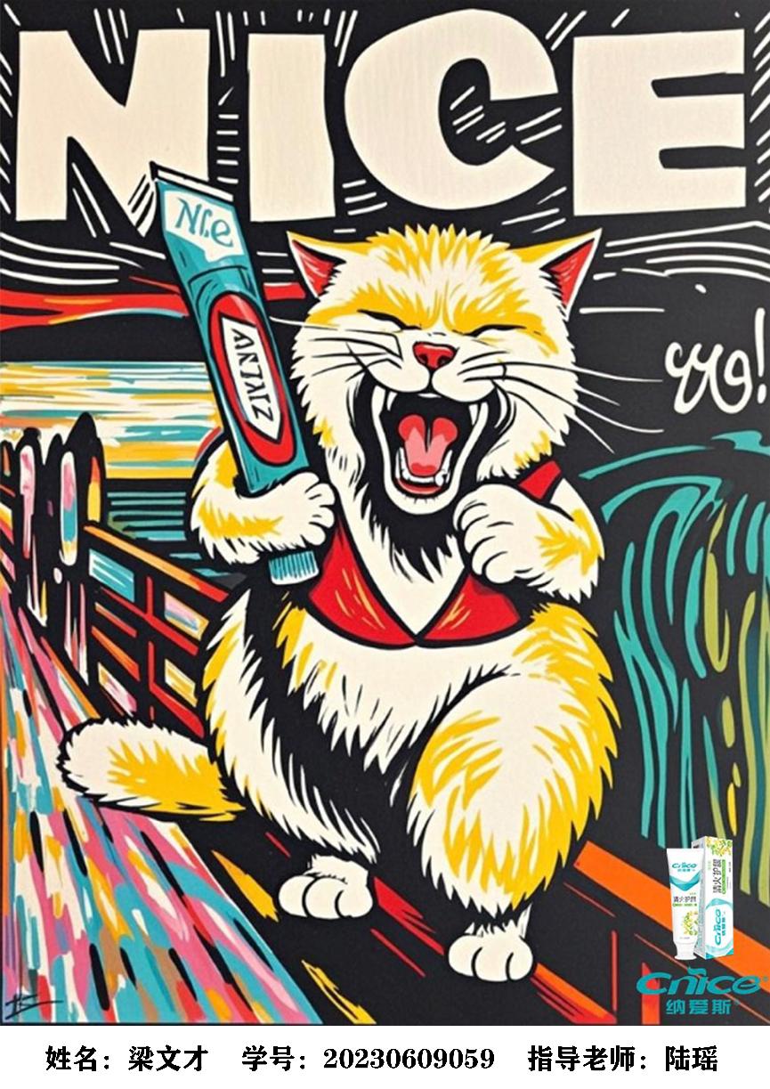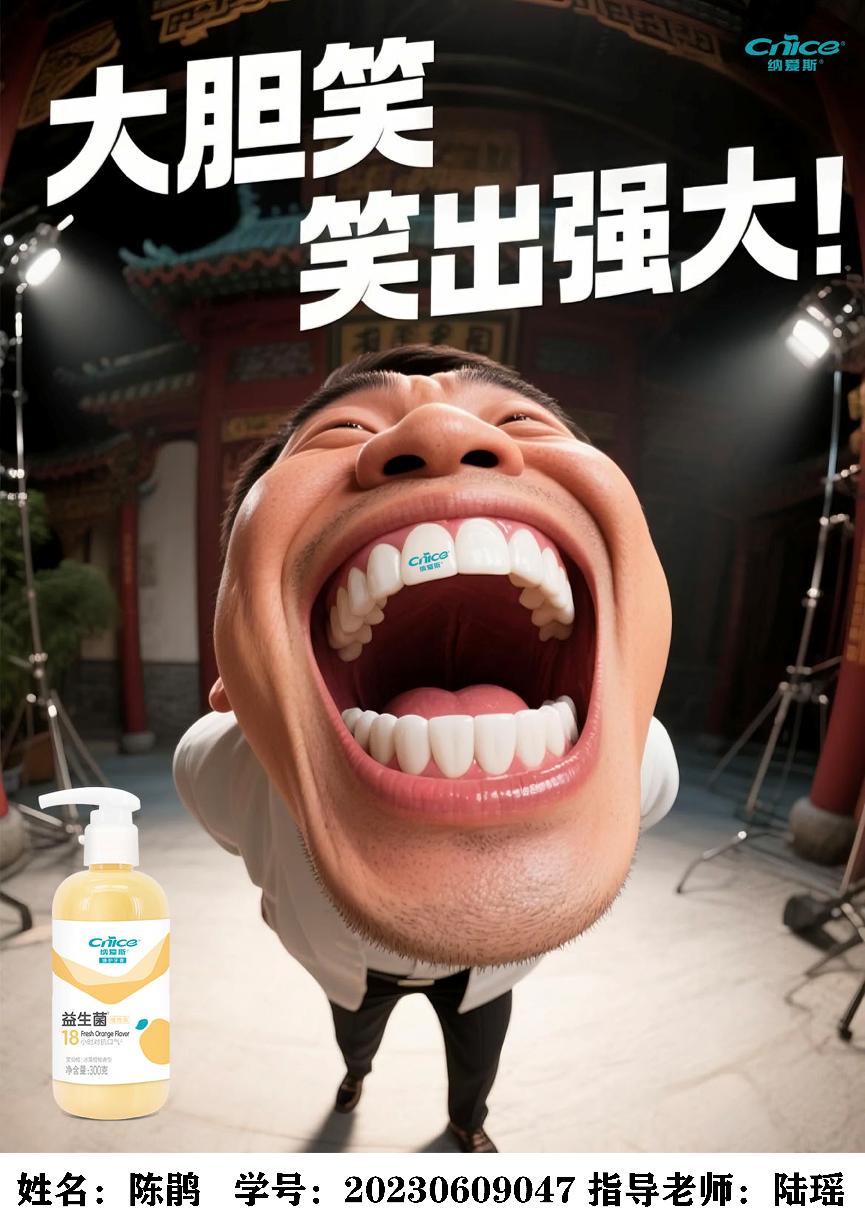 学生作品呈现出丰富的设计风格与创意表达。创作者们分享了学习心得:“之前总觉得设计需要天赋,但AI工具让我发现,只要敢想敢试,每个人都能创造出专业级的作品。”也有学生表示:“通过学习AI绘画,我不再被‘不会画画’束缚,现在能将自己的商业策划用视觉化方式呈现,这对我们专业的营销方案制作帮助极大。”另一位学生坦言:“课程最让我惊喜的是,AI不仅提供技术辅助,更教会我们用设计思维解决问题,这让我对未来的职业发展更有信心。”教师陆瑶评价,学生们通过课程不仅掌握了工具,更形成了“技术+创意”的双向思维模式,作品质量远超预期。