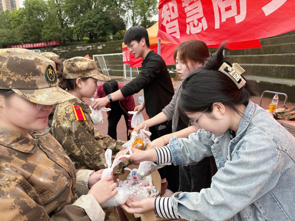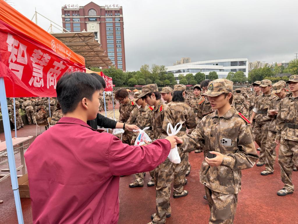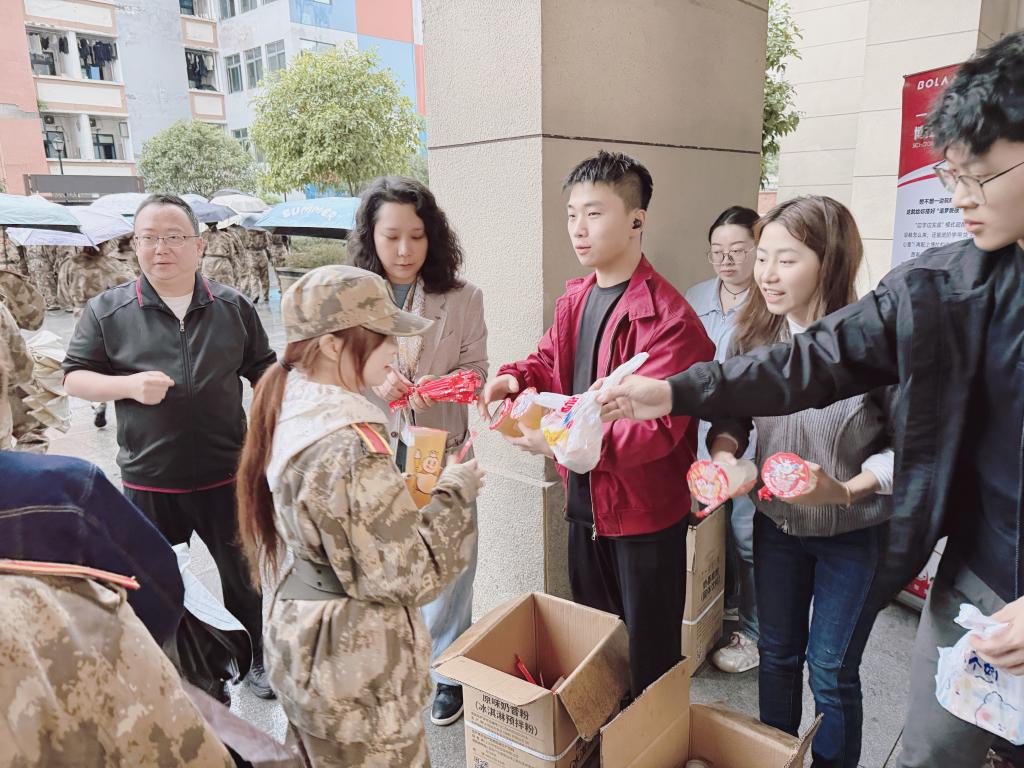 10月20日下午,受降雨天气影响,“博拉班”新生军训场地紧急调整至室内训练大厅。尽管天气突变,博拉慰问团队仍严格按计划准时抵达校园,并根据场景变化动态优化慰问物资。