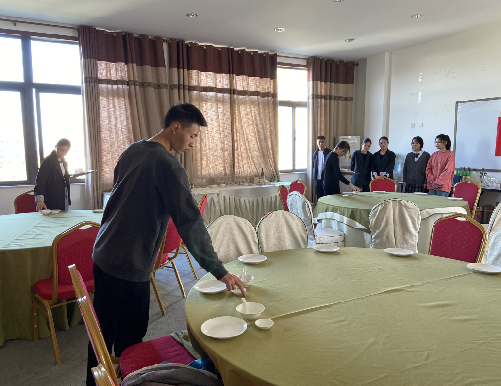 为学生展开技能竞赛知识普及,继而为2021年“巴渝工匠”杯市竞赛备赛选手选拔。酒店管理教研室全体教师、19级校级技能竞赛课程班级学生代表、参加过中职升高职专业技能测试的学生参与观摩。活动分为英语水平测试、中餐摆台测试和礼仪测试是三方面。