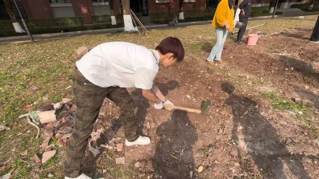 活动伊始,同学们迅速投入前期整地清杂工作。大家分工协作,细致拔除杂草、清理枯枝落叶,深挖根系;同时俯身捡拾耕地中的石块,耙平土地,让原本杂乱的耕地变得松软平整,为蔬菜生长打好基础。