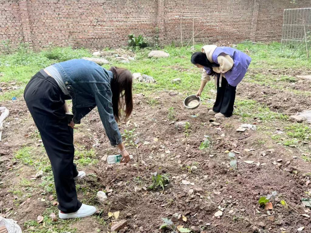 活动伊始,师生们带着锄头、耙子等工具迅速投入劳作。大家分工协作,仔细拔除田间杂草,认真翻松板结土壤,为作物生长营造疏松透气的环境。随后,按照科学配比施肥,小心移栽生菜、莴苣幼苗,再用水盆逐株浇灌,让清水浸润每一寸土地,用细致呵护为作物生长筑牢基础。