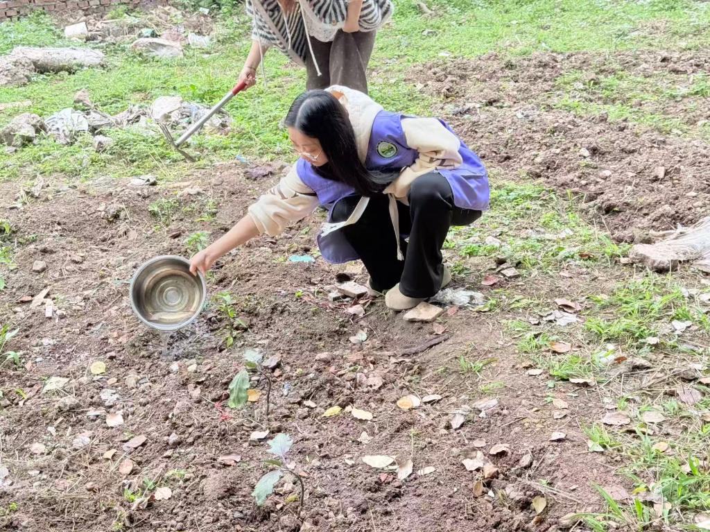 完成田间养护后,同学们开启新苗种植关键环节。从挖坑、放苗到覆土、压实,每一步都一丝不苟,确保幼苗顺利扎根。种植任务完成后,大家又主动搭建竹篱笆,用错落的木条勾勒出整齐的菜园边界,既为作物筑牢“防护屏障”,也为朴素的菜地增添了清新的田园意趣。