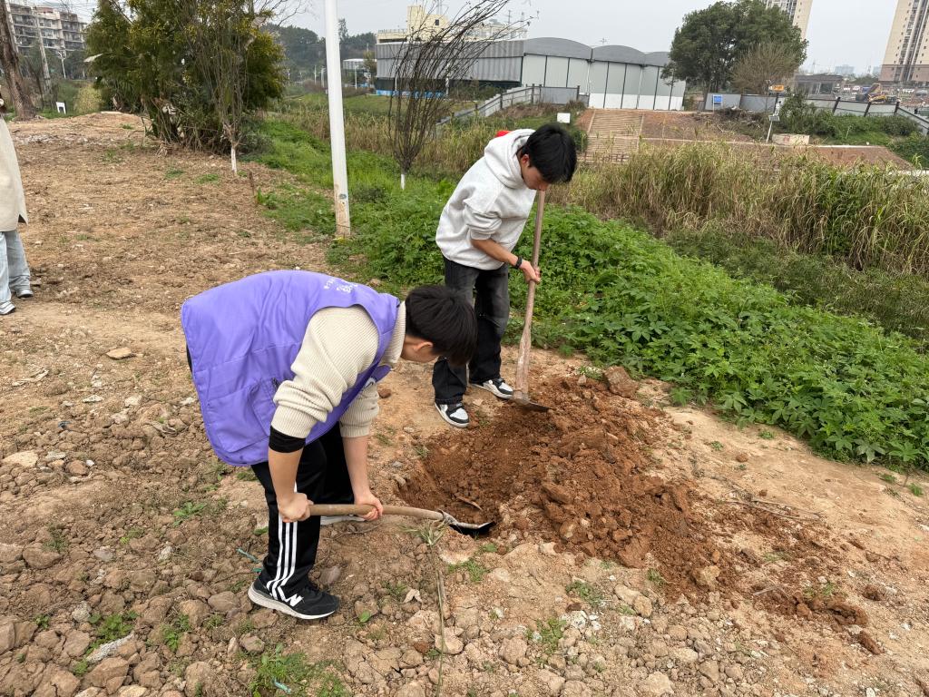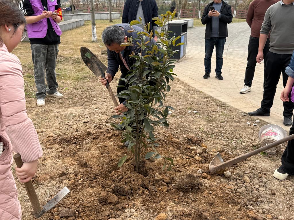 活动当日,师生党员抵达植树现场,在社区工作人员简单讲解注意事项后,大家迅速行动起来。师生党员充分发挥先锋模范作用,带头领取树苗、工具,挖坑、栽种、培土、浇水,每一个环节都认真细致。师生与社区居民紧密配合,三人一组、五人一队,干劲十足。有的挥锹铲土,有的扶苗填坑,有的提桶浇水,现场呈现出一片热火朝天的劳动景象,大家积极投入,用实际行动践行绿色环保理念。