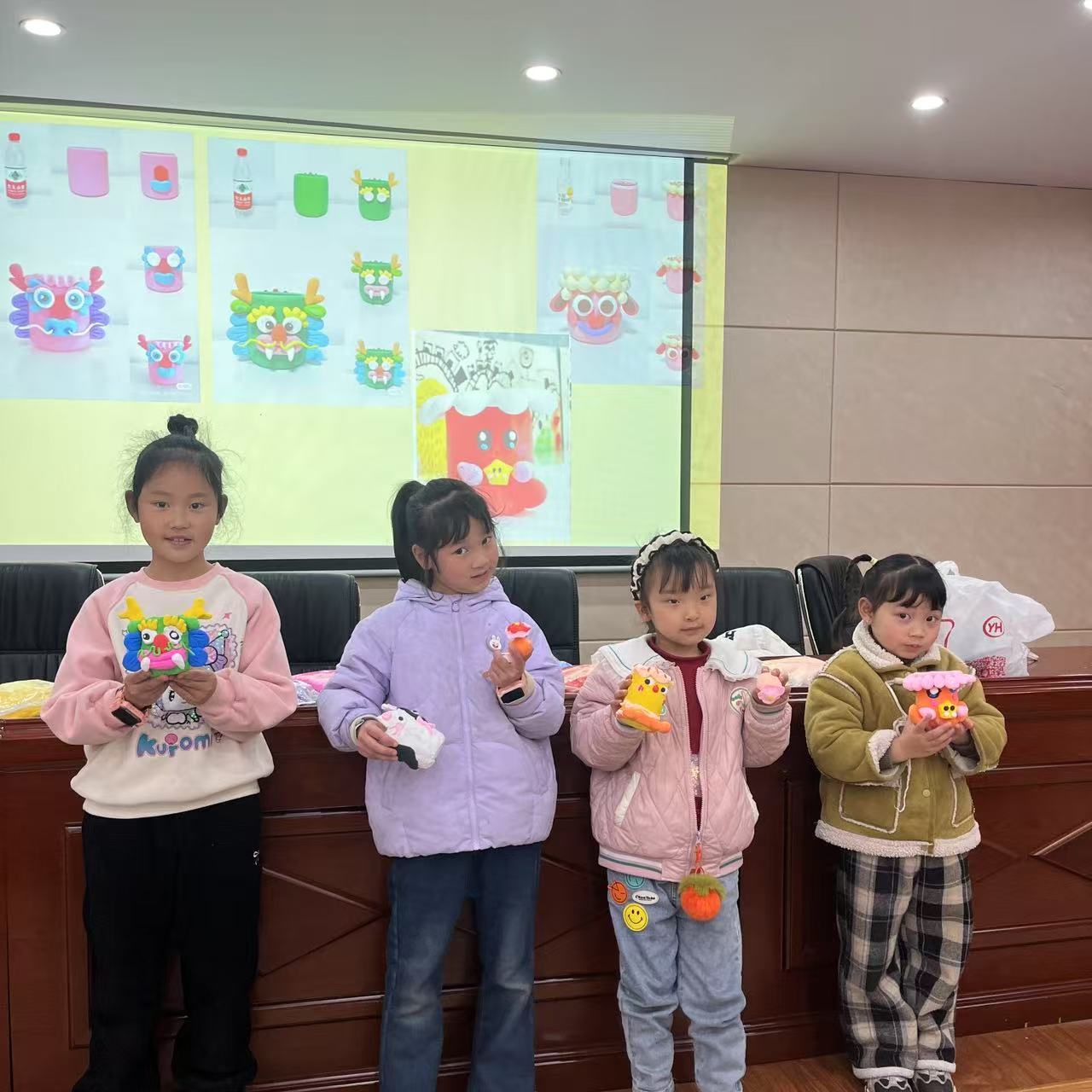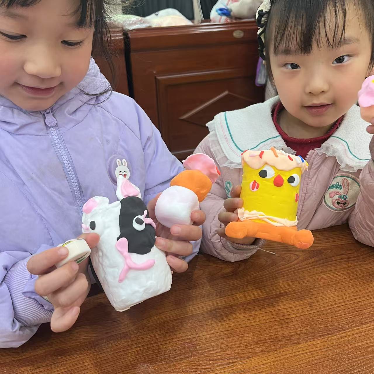 活动筹备阶段,志愿者们践行环保理念,将回收的矿泉水瓶精心改造成笔筒底座。活动现场,志愿者们化身"创意导师",通过趣味问答引导孩子们理解变废为宝的环保意义。在亲子协作环节,五彩缤纷的超轻粘土在孩子们手中焕发生机——有的捏出憨态可掬的熊猫造型,有的塑造出星空主题的渐变效果,还有的镶嵌上精致的花朵装饰。志愿者穿梭于各个家庭之间,适时给予技法指导,同时鼓励孩子们自主探索材料特性。