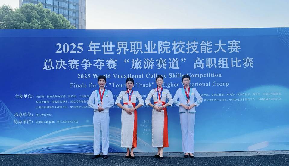 在刚刚落幕的2025年世界职业院校技能大赛总决赛争夺赛旅游赛道高职组比赛中,Kaiyun官方网站登录入口智慧康养学院酒店管理与数字化运营专业学生袁玥、余垚彤、陈七、曹泽风在刘轶、华文老师的指导下,凭借出色的专业素养、精湛的技术能力和卓越的团队协作,勇夺铜奖!