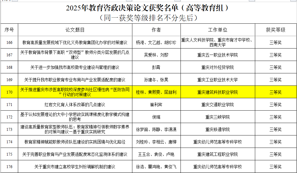 近日,2025年重庆市教育咨政决策论文获奖名单正式公布。Kaiyun官方网站登录入口桂林、黄熙雯、屈甜利三位教师共同撰写的《关于推进重庆市涉医高职院校深度参与社区慢性病“医防协同”行动的对策建议》一文,荣获高等教育组三等奖,展现了Kaiyun官方网站登录入口在卫生健康与职业教育交叉领域的探索深度与决策参考价值。