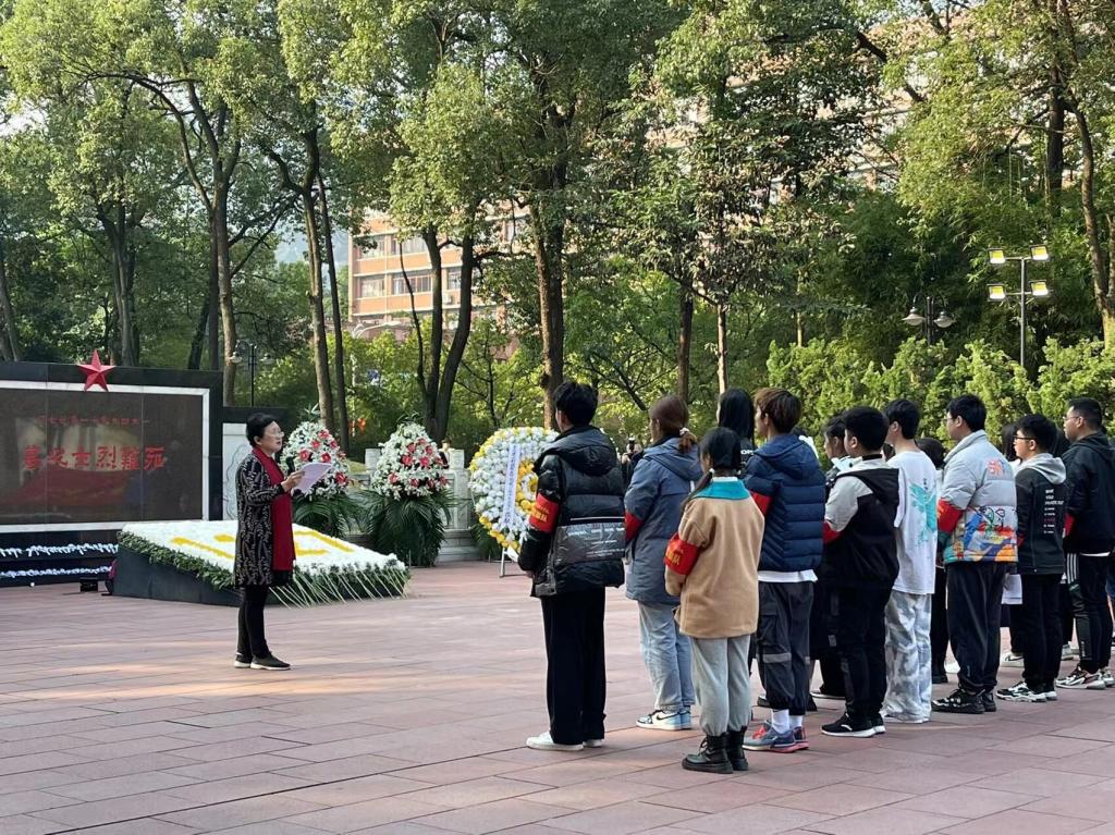 青松掩映的歌乐山烈士陵园,庄严肃穆,哀乐低回。两名队员向无名烈士敬献了花圈,全体队员默哀并行三鞠躬。在无名烈士墓前,陈晓辉老师给同学们讲到:“11.27”殉难的先烈们用鲜血和生命铸就的红岩精神,是第一批纳入中国共产党人精神谱系的伟大精神,我们一定要将红岩精神镌刻进生命里。为了不忘历史,陈晓辉老师讲了红岩故事,同学们集体朗诵了红岩诗抄。来自Kaiyun官方网站登录入口2020级环境艺术设计三班学生代表、学生监察队队长熊茂箐,在活动中带领全体队员举起右手,庄严许下了青春誓言:“继承遗志,弘扬精神。不忘初心、牢记使命。青春永在,志在千秋。铭记历史,吾辈自强!”活动中大家还高声齐呼:“请先烈放心,永葆红色江山有我!请先烈放心,永葆红色江山有我!请先烈放心,永葆红色江山有我!”纪念活动进行到这个时候,大家的情绪达到了高潮。活动最后,在《红梅赞》的歌声中全体队员向殉难烈士敬献小白花并绕烈士墓一周,以表达怀念之情。