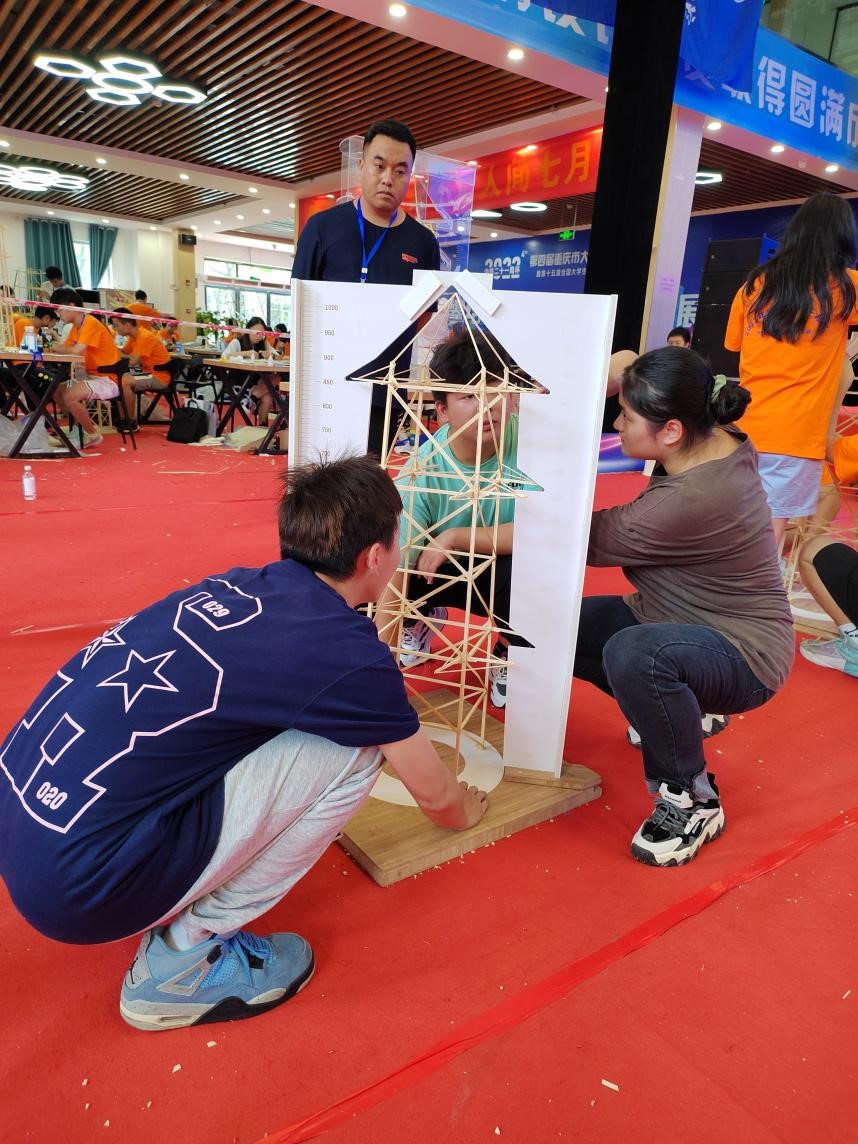 此次比赛以应县木塔为原型,参赛选手在16小时之内使用大赛提供的材料和工具,结合软件模拟结果,现场制作模型,最后依次进行合规性检测、称重、加载等测试。学校三支参赛队伍共参加此项赛事,经过为期三天的紧张角逐,通过不断的尝试和完善,最终取得了二等奖1个、三等奖2个的优异成绩。