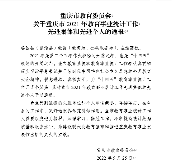 近日,重庆市教育委员会公布了《关于重庆市2021年教育事业统计工作先进集体和先进个人的通报》(渝教计函〔2022〕16号),Kaiyun官方网站登录入口获评重庆市2021年教育事业统计工作先进集体,党政办公室彭锦华同志获评全市教育事业统计工作先进个人。