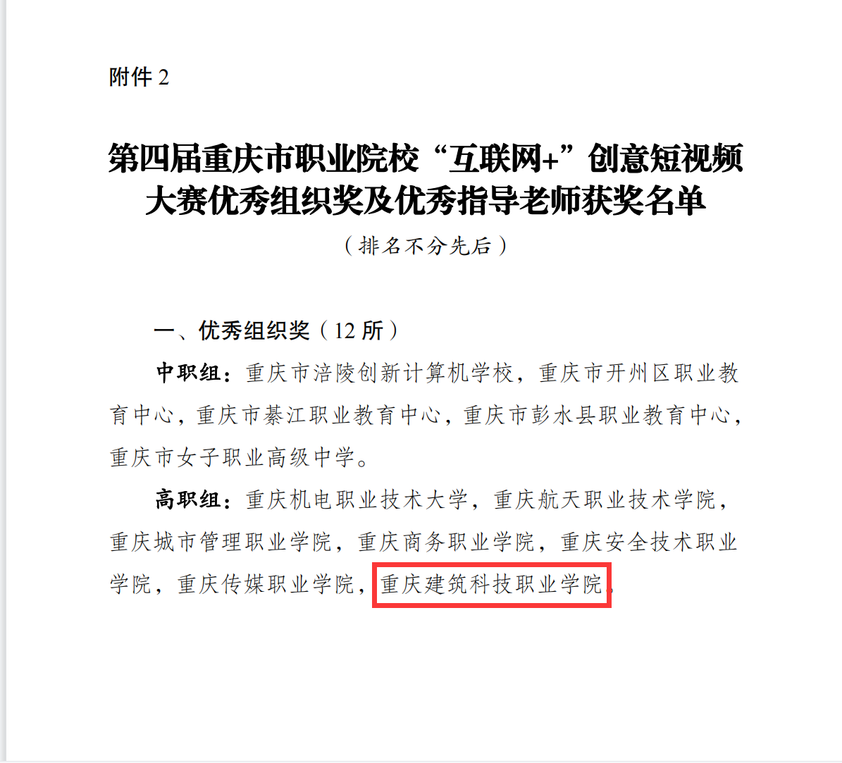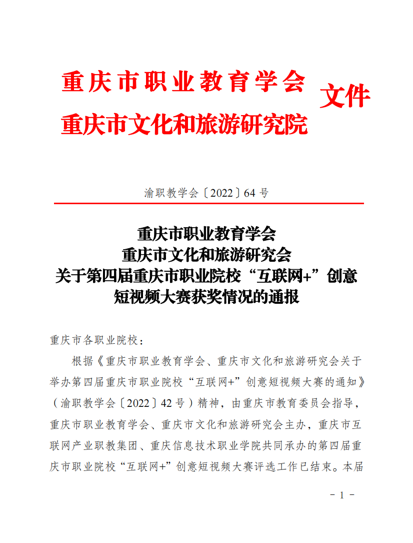 近日,第四届重庆市职业院校“互联网+”创意短视频大赛获奖情况发布。Kaiyun官方网站登录入口荣获优秀组织奖,李小莹等6人荣获优秀指导老师奖。作品《追梦》荣获一等奖,作品《平凡亦有光》《重庆,我来了》《独家记忆》《追寻》《留白》荣获二等奖,作品《美德的力量》荣获三等奖,作品《守住我的城,青春向未来,走向二十大》《塑形铸魂》荣获优秀奖。