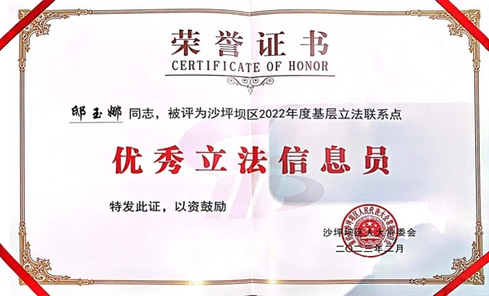 邸玉娜老师在学校党群工作部的推荐下,自2022年5月起担任沙坪坝区陈家桥街道基层立法联系点信息员,认真履行职责,结合专业知识和本职工作,积极参与相关工作,广泛收集民情民意,积极献言献策,做好法律的普及和宣传教育工作。受到沙区人大常委会、陈家桥街道的一致好评,为提高地方立法的质量做出了应有贡献。