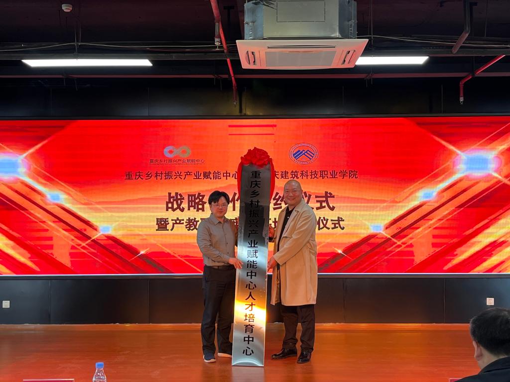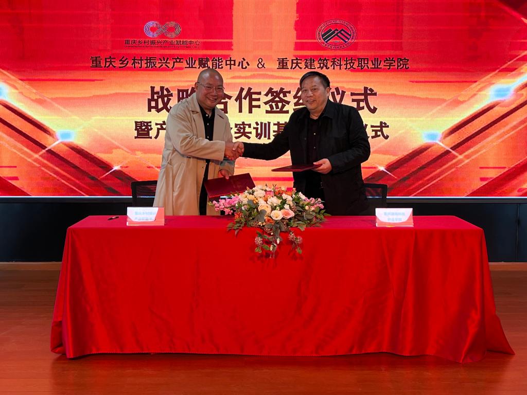 仪式在重庆乡村振兴产业赋能中心举行。学校校长刘东燕、副校长周俊华、房地产商学院院长彭汝伦、产业办公室副主任湛杨、环境艺术学院院长助理张红琼,重庆乡村振兴服务协会副会长马均,重庆乡村振兴产业赋能中心主任任一行,重庆市江北区商务委二级调研员唐燕,重庆新隆合农业科技有限公司总经理李俊等领导出席签约授牌仪式。
