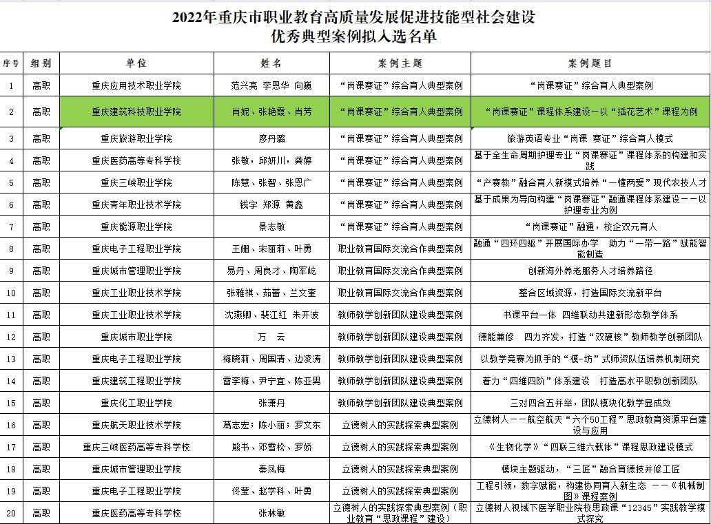 近日,按照重庆市教育科学研究院《重庆市教育科学研究院关于开展2022年重庆市职业教育高质量发展促进技能型社会建设主题论文及典型案例评选活动的通知》文件精神,学校高度重视、积极组织,经评选,Kaiyun官方网站登录入口共有2个项目获得市级奖项。其中,刘轶、周福亮、彭汝伦团队和肖妮、张艳霞、肖芳团队在评选中,分别获得“主题论文三等奖”和“优秀典型案例”奖项。