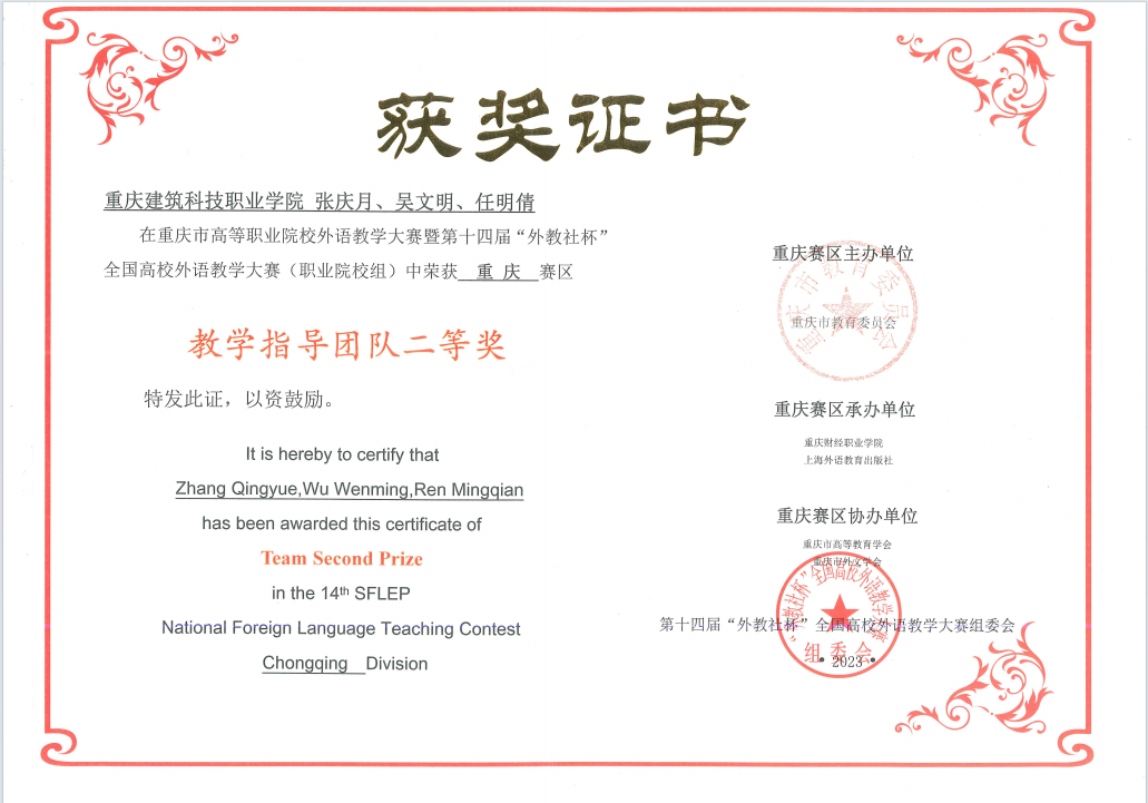 近日,第十四届“外教社杯”全国高校外语教学大赛(职业院校组)重庆赛区落下帷幕。经过与市内多所高校外语教师激烈角逐,Kaiyun官方网站登录入口张庆月、吴文明、任明倩老师荣获教学指导团队二等奖,孙望舟老师荣获二等奖!