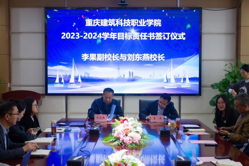 会上,在集团领导的见证下,校长刘东燕分别与学校各分管领导、职能部门和二级学院负责人签订了2023-2024学年目标责任书。