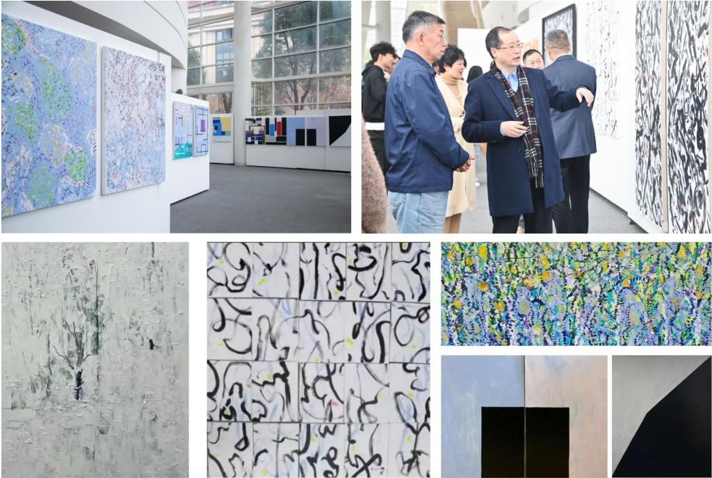 展览共分为三个主题:在场的虚像、涌现的诗意、叠加的真境。夏之宁通过抽象的表现方式,呈现出个体与相互、涌现和全息等哲学概念。探讨着人类思维、情感和认知的复杂性,以独特的视角反映人类的精神世界,及人与世界之间的关系。这种探索挑战传统视角,激发观众重新审视世界的方式。展览现场,学校环境艺术学院教师袁箫、吴雨桐与夏之宁教授就本次展览主题,围绕展览作品的立意、图示表达、视觉经验等展开对谈。