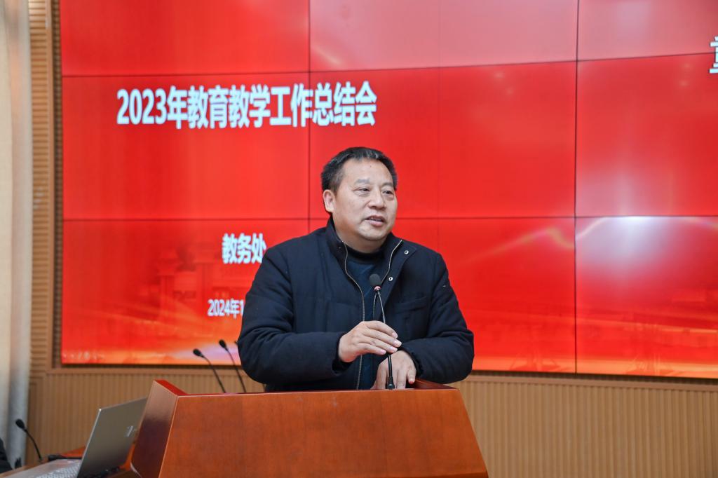 学校校长刘东燕为此次大会作总结发言。他对学校年度教学工作的开展与取得的成果给予了充分肯定。他指出,教育教学工作应时刻“牢记三句话”:“大学的根本任务是培养人才、学校的中心工作是教学工作,提高人才培养质量是永恒主题。“做好三件事”:“稳定教学秩序、做好改革创新、推动高质量发展。”他表示,教育事业的高质量发展离不开改革创新,学校应该跟上国家现代职教体系发展的步伐,把改革创新成果应用到教学实践中去,产生具有实际意义的人才培养成果成效;以人才培养模式改革创新为平台,让教师跟上新时代教育发展的步伐,促进教师自身成长,全面提高教师综合能力;只有教师综合能力提升了,教育教学质量才能提高,学生可持续多样化发展的根本才能保障。在新的一年里,学校将持续深耕教育教学改革工作,与所有老师一起踔厉奋发,持之以恒开展人才培养模式改革、创新、实践、应用,为教育教学事业添光加彩。