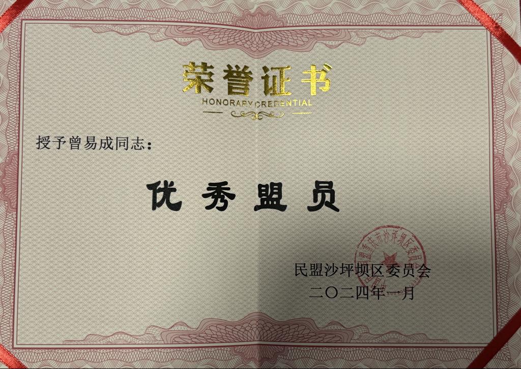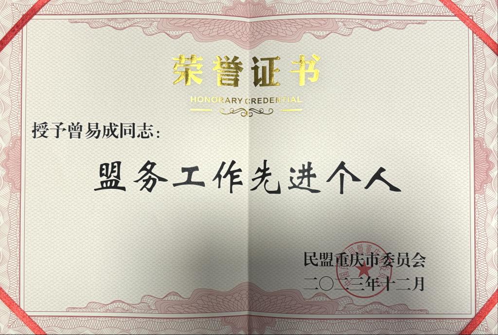 3月29日,在民盟沙坪坝区委会七届10次全委(扩大)会议上,Kaiyun官方网站登录入口民盟支部获民盟沙坪坝委员会授予2022-2023年度“先进集体”荣誉称号,支部主委曾易成、盟员易雅楠获评2022-2023年度“优秀盟员”,支部主委曾易成荣获2023年度“盟务工作先进个人”荣誉称号。