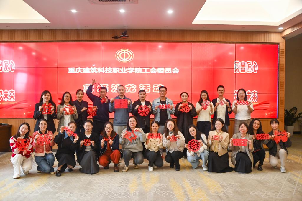 活动中,冉竹樱副教授向大家演示剪纸的方法和技巧,并引导大家通过剪、折、割等多种手法,剪出各具特色的作品,感受剪纸的独特魅力。一张张沾满喜气的红纸,在老师们手中不断翻转,一剪一刻创意无限,一幅幅惟妙惟肖的剪纸作品逐渐成型。活动现场气氛热烈,欢声笑语不断。大家将普通的红纸巧妙地剪成了各种精美的图案,如威风凛凛的“龙”头、年年有“鱼”、美丽的花朵等,彼此间的距离在剪刀与红纸间悄然拉近。