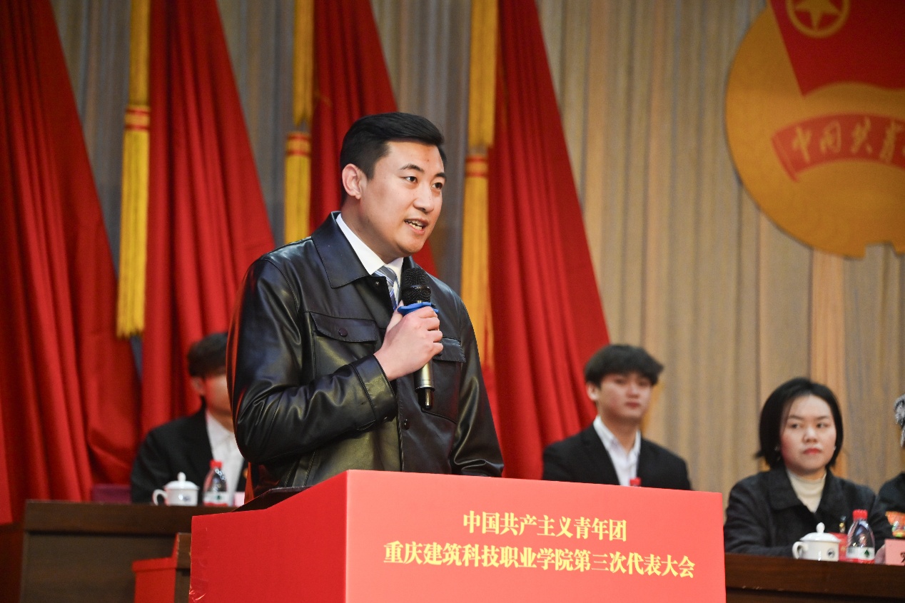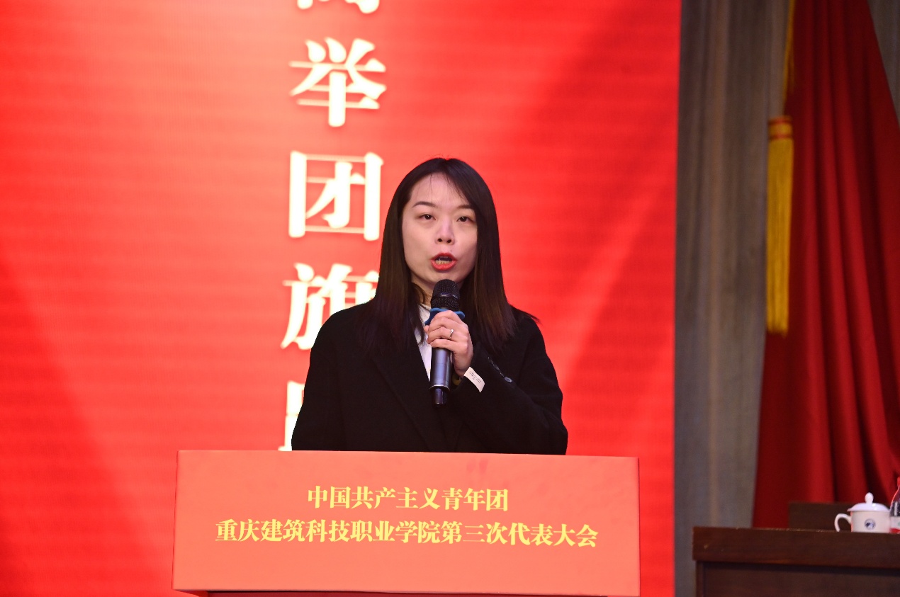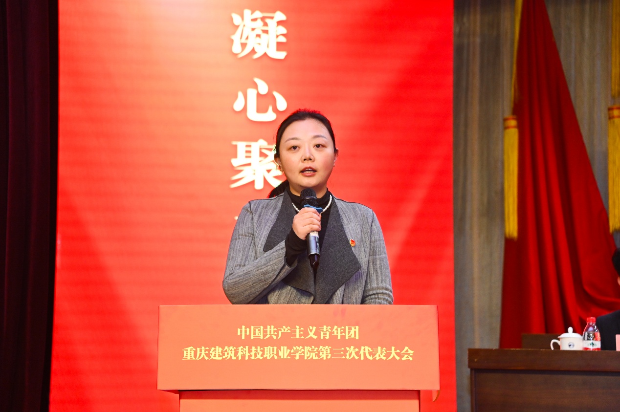 校长助理、工会主席晏华致辞,指出共青团和工会作为党领导的群团组织,在团结和引领群众、服务学校发展中肩负重要职责。重庆财经学院团委书记夏文瑞向大会的顺利召开表示热烈祝贺。沙坪坝区团委副书记李力则充分肯定了学校共青团近年来取得的突出成绩,并表达了对未来加强校地合作、共促共青团事业发展的美好期望。共青团重庆市委副书记杨春渝发表讲话,她充分肯定了学校共青团近年来的突出成效,并提出四点期望:一是切实加强青年师生的政治引领,深入推进用习近平新时代中国特色社会主义思想凝心铸魂,强化团组织与思政课的有机融合,教育青年坚定信念;二是广泛动员青年服务国家和区域发展战略,实施“青年实干家建设新重庆计划”,组织青年积极投身社会实践与公益服务;三是更好地联系和服务青年,通过“我为青年办实事”等活动解决师生实际问题,增强获得感与幸福感;四是对标全面从严治党推进从严治团,推动“红岩先锋”变革型团组织建设,进一步规范团组织管理和团员发展。杨春渝副书记的讲话为学校共青团工作提供了方向指引,进一步激发了青年团员的奋斗热情。开幕式最后,校党委副书记、副校长李果同志发表讲话。他提出,学校正处在全面推进中国一流职业大学奋斗目标建设的关键节点,全校各级团组织一定要高举习近平新时代中国特色社会主义思想伟大旗帜,凝心聚力、奋发进取,引领广大青年坚定理想信念,做自觉自信的建院青年,讲话表达了对青年团员的殷切期望与鼓励。
