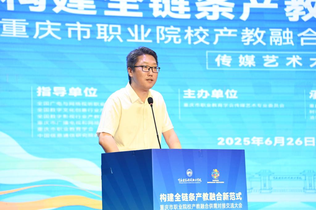 重庆市职业教育学会传媒艺术专业委员会理事长刘晓东教授分享了专委会九年来的探索之路。重庆大学产业技术研究院执行院长葛垚教授从科研创新视角解读产教融合深层价值,强调科研与产业协同对职业教育发展的重要性。厦门风云科技股份有限公司副总经理邹磊先生作为企业代表,表达了企业对技能人才的迫切需求与合作愿景,期待与院校深化合作,共育优质人才。