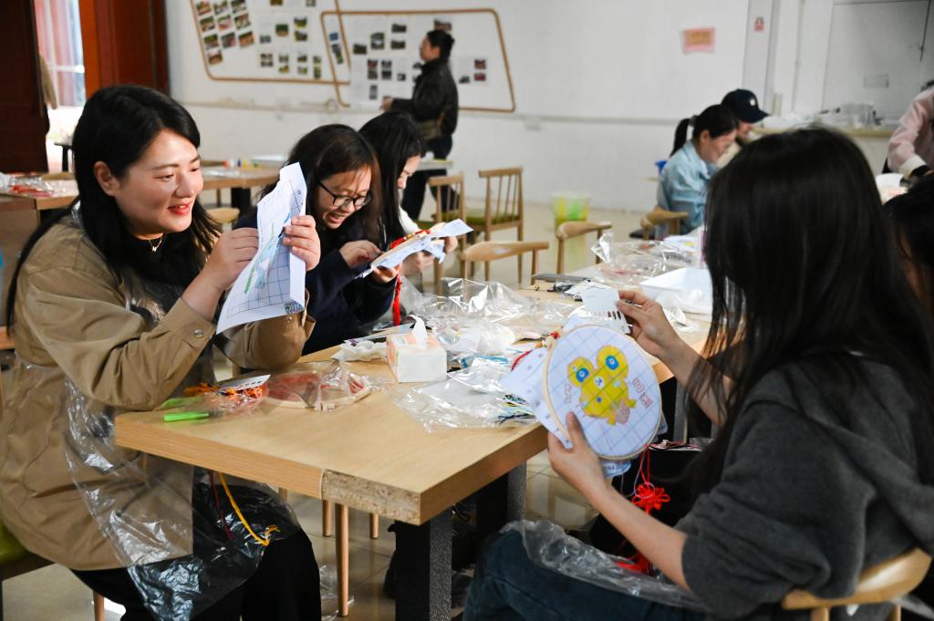 活动现场氛围温馨雅致、暖意融融,工作人员提前备好手绢、水拓画颜料、针、线、绣绷等各类手工物料,全程为大家提供细致贴心的指导服务。相较于复杂的扎染技艺,本次选取的手绢水拓画与十字绣两项手工艺,兼具趣味性与实操性,更贴合女教职工的创作需求,上手轻松、体验感十足。