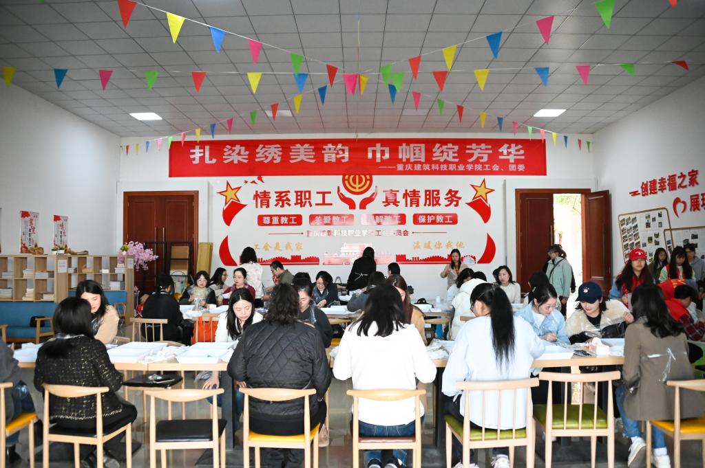 参与活动的女教职工们兴致盎然、各展巧思,大家围坐在一起,沉浸式投入手工创作。在手绢水拓画环节,大家轻滴颜料、缓缓拓印,让色彩在绢布上自然晕染,每一块手绢都化作独一无二的艺术作品,尽显灵动之美;在十字绣环节,大家穿针引线、细心勾勒,一针一线间凝聚匠心,绣出精致纹样,尽显温婉才情。大家相互交流技巧、分享创作心得,欢声笑语萦绕全场,在慢节奏的手作时光里卸下工作疲惫,尽享手工乐趣。
