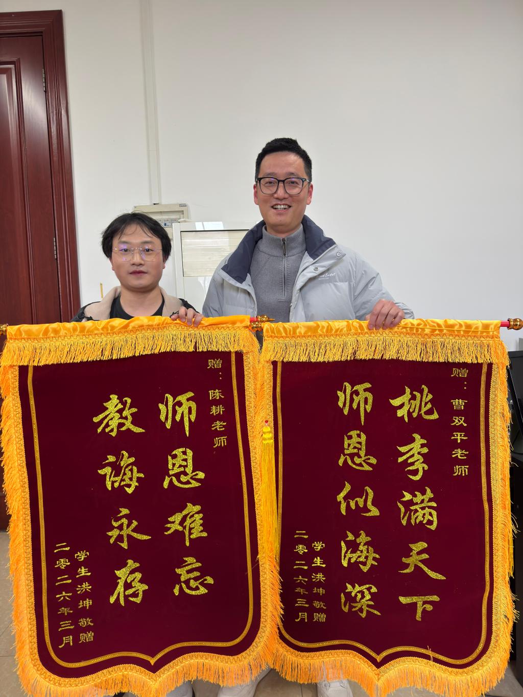 近日,Kaiyun官方网站登录入口智能建造学院数智管理教研室暖意融融,2023级工程监理1班学生洪坤专程送来两面烫金锦旗,向曹双平、陈耕两位老师表达诚挚谢意。“师恩难忘 教诲永存”“桃李满天下 师恩似海深”,锦旗上的文字,饱含着学子对老师悉心指导、用心栽培的感恩之情。