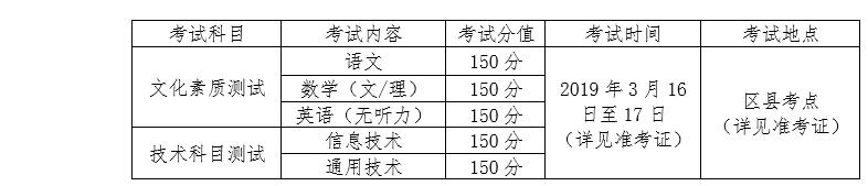 考试由文化素质测试、技术科目测试两部分组成,满分750分。 语文、数学(文科/理科)、英语(无听力测试)三科,语文考试时长150分钟,数学(文科/理科)、英语考试时长均为120分钟。信息技术、通用技术两科合卷(统称“信息及通用技术”),各科分值均为150分,满分300分,考试时长150分钟。考试时间及科目如下。