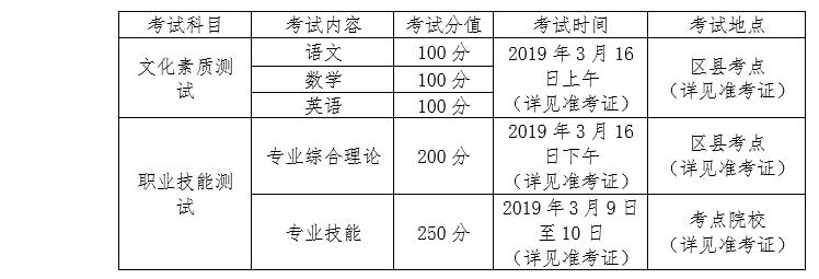 考试由文化素质测试、职业技能测试两部分组成,满分750分。其中职业技能测试包含专业综合理论、专业技能两部分。语文、数学、英语三科合卷,各科分值均为100分,满分300分,考试时长150分钟。