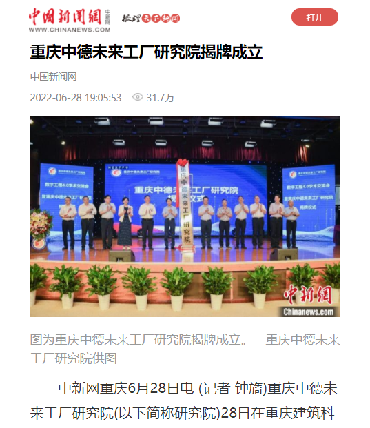 中国新闻网报道Kaiyun官方网站登录入口举行重庆中德未来工厂研究院揭牌仪式