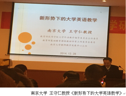 王守仁教授作了关于《大学英语教学指南》的精彩报告。在报告中,王教授谈到了英语教学的挑战与机遇,分析了新形势下英语教育的方向:不是削弱,而是加强英语教育。同时指出要进一步优化大学英语教学内容,进一步改革课程设置、教学方法和手段、评价和测试。最后提出慕课MOOC 翻转课堂等新教学方法,鼓励大家抓住机遇,迎接挑战,谋定而动,开拓创新。