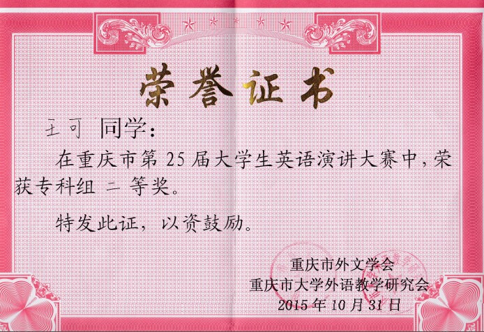 2015年10月31日,由重庆市外文学会和重庆市大学外语教学研究会共同主办的重庆市第二十五届大学生英语演讲比赛在景色秀丽的四川外国语大学隆重举行。