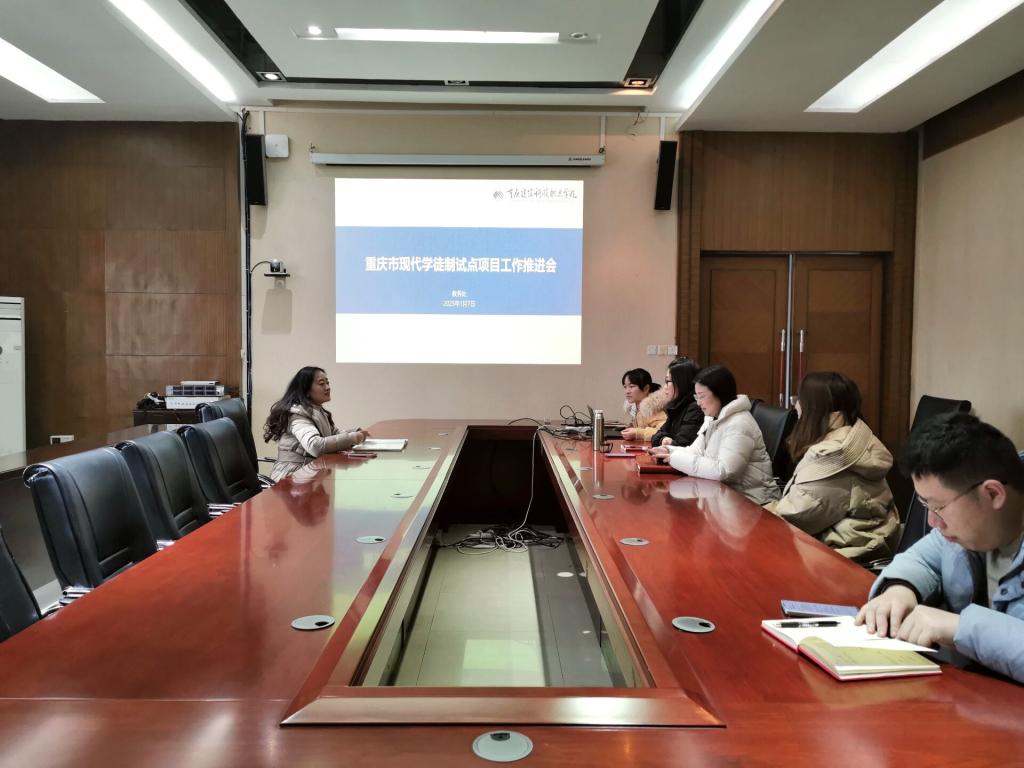 2025年1月8日上午9:30,重庆市现代学徒制试点项目工作推进会在学校立德楼 B506 会议室召开。此次会议由教务处处长叶颖娟主持,新能源汽车技术专业与建筑工程技术专业这两大现代学徒制试点项目的负责人参会,教务处工作人员全程列席。