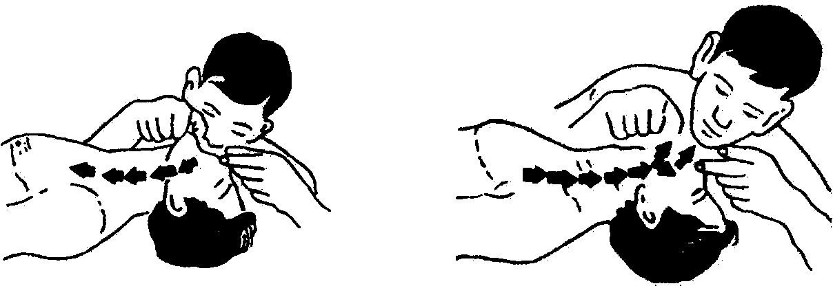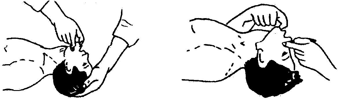 2-5    身体仰卧,头部后仰        图 2-6    捏鼻掰嘴准备进行