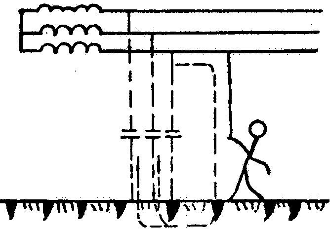 2-1 中性点接地系统的单线触电  图 2-2 中性点不接地系统的单线触电