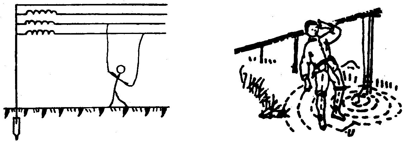 如图 2-4 所示,当人体在具有电位分布的区域内行走时, 人的两脚(一般相距以 08m 计算)分别处于不同电位点,使两脚间承受电位差的作用,这一电压称为跨步电压。跨步电压的大小与电位分布区域内的位置有关,在越靠近接地体处,