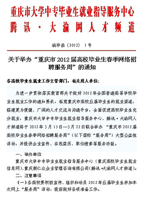 关于举办“重庆市2012届高校毕业生春季网络招聘服务周”的通知[03-19]