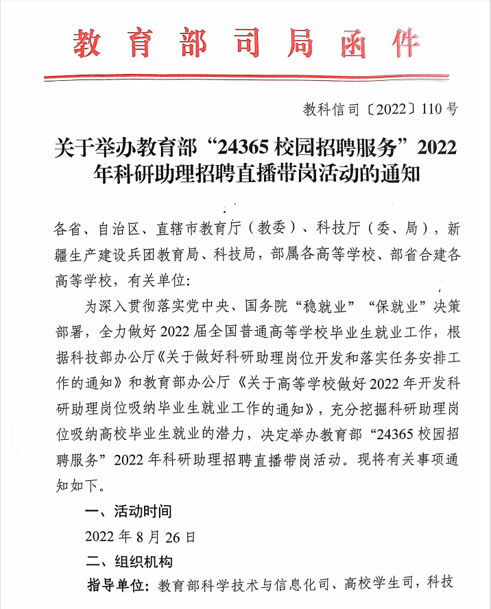 关于举办教育部“24365校园招聘服务”2022年科研助理招聘直播带岗活动的通知