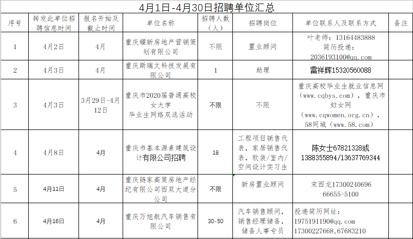 4月1日-4月30日招聘单位汇总