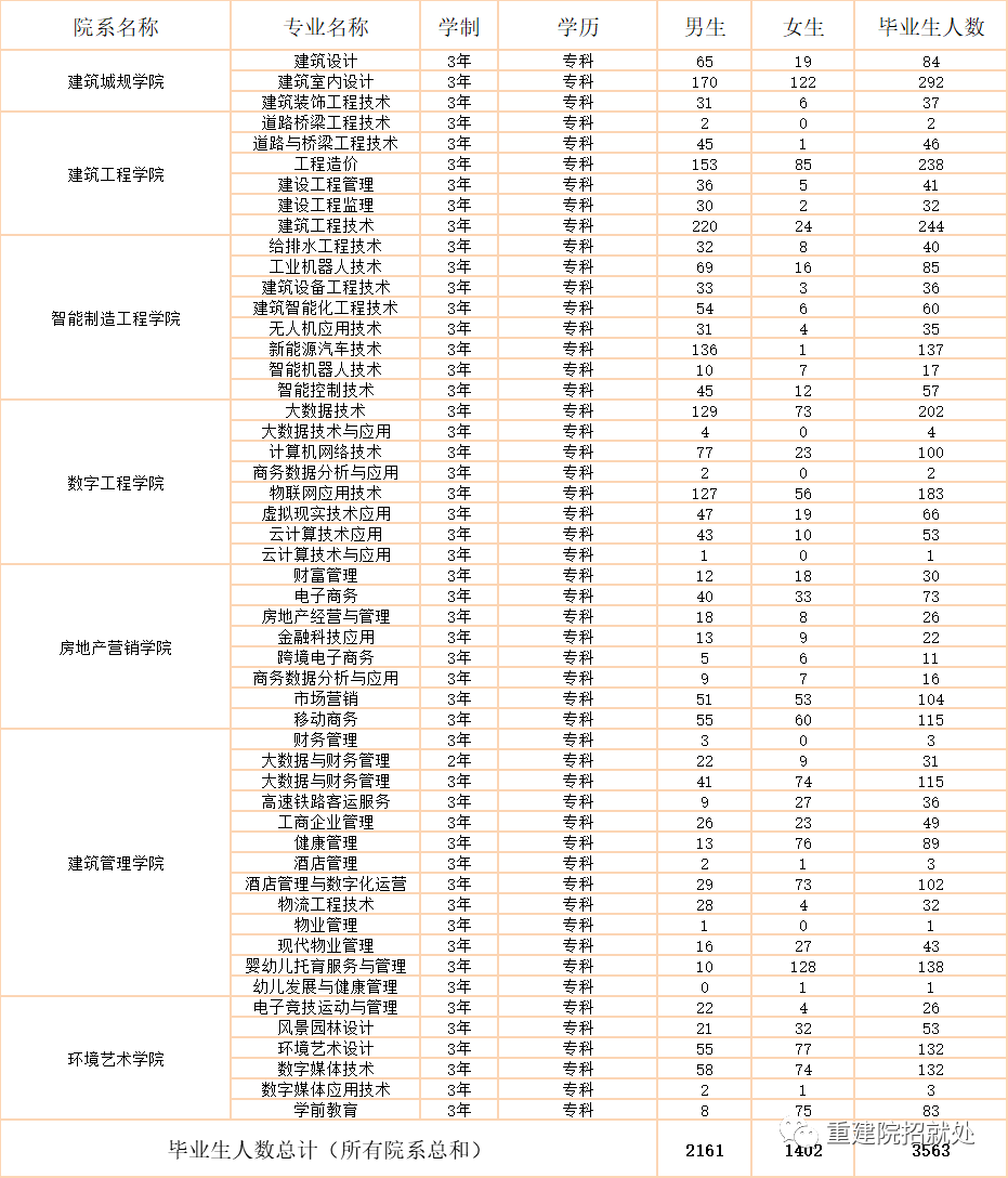 学校设有建筑城规学院、建筑工程学院、智能制造工程学院、数字工程学院、房地产营销学院、建筑管理学院、环境艺术学院、基础教学部(马克思主义学院)8个二级院(部)。学校以建筑现代化为主线,以绿色建筑智能化、新型建筑工业化、建筑产业信息化为重点,在建筑产业核心领域、建筑服务业领域、建筑科技关键技术支撑领域,形成了六大专业群,共46个专业。