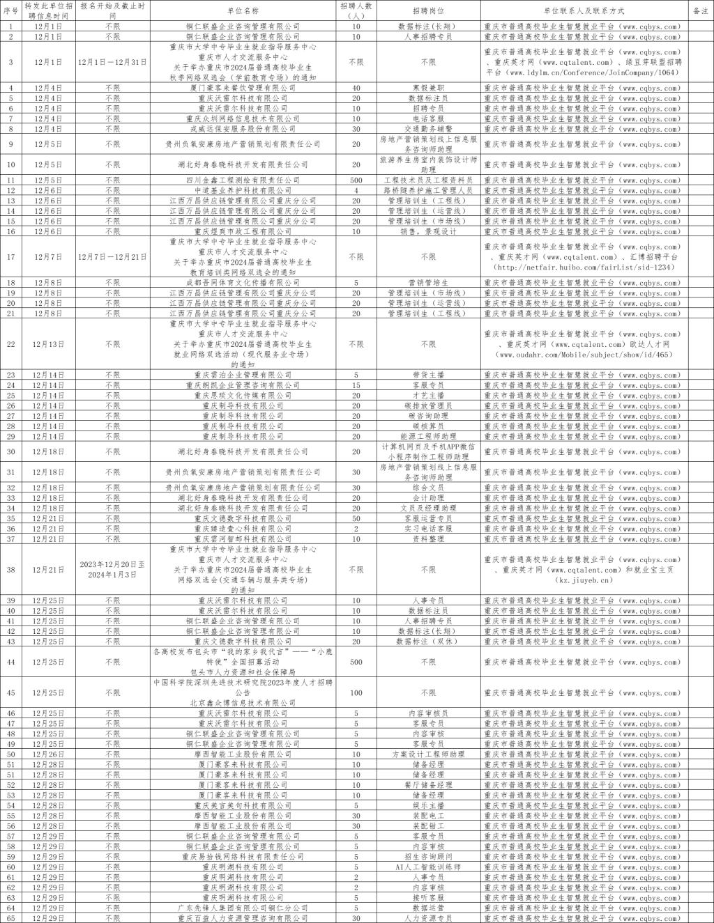 12月1日-12月31日招聘单位汇总