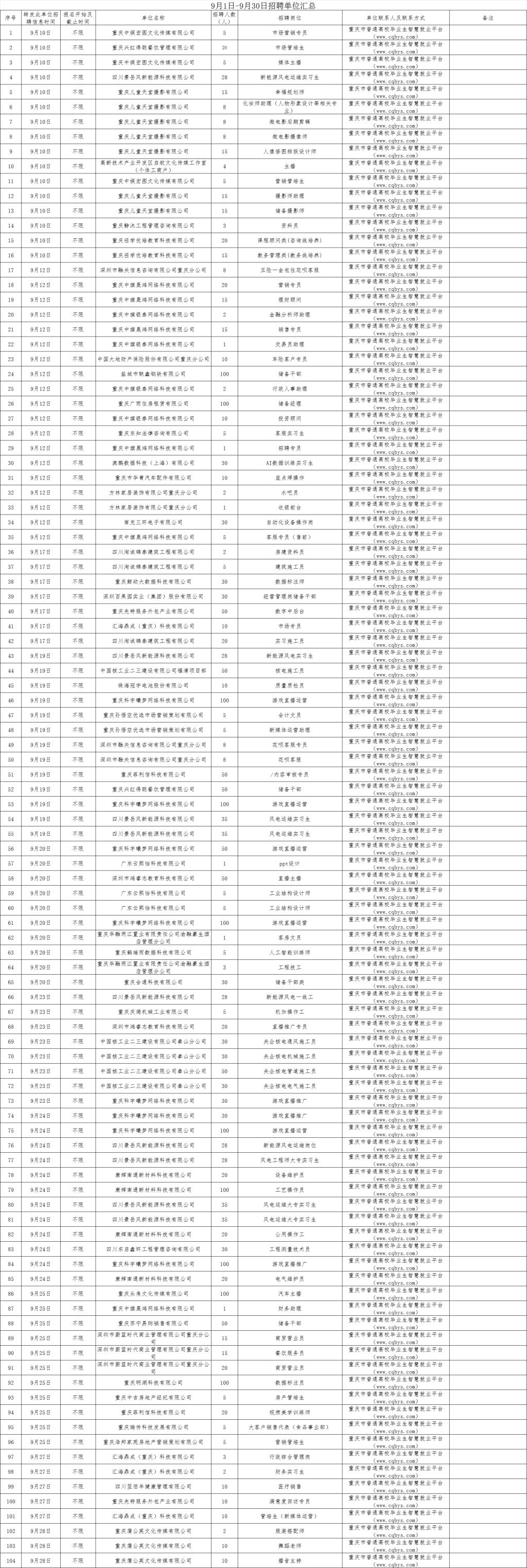 9月1日-9月30日招聘单位汇总