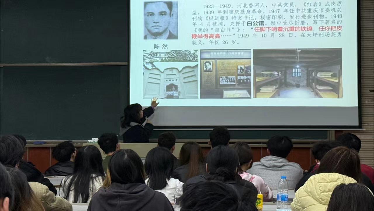 在“英烈故事重温”环节,教师讲解江竹筠、陈然、许建业、刘国鋕等红岩英烈的英勇事迹震撼人心。面对酷刑坚贞不屈的江姐、狱中写下《我的 “自白书”》的陈然、宁死不泄露机密的许建业、拒绝重金营救坚守信仰的刘国鋕,以及最小烈士 “小萝卜头” 宋振中的故事,深刻诠释了 “红岩精神” 的内涵,并邀请学生通过讲述红岩英烈的事迹,结合自身所处的新时代背景畅谈感悟,让红色精神指引青年逐梦前行。