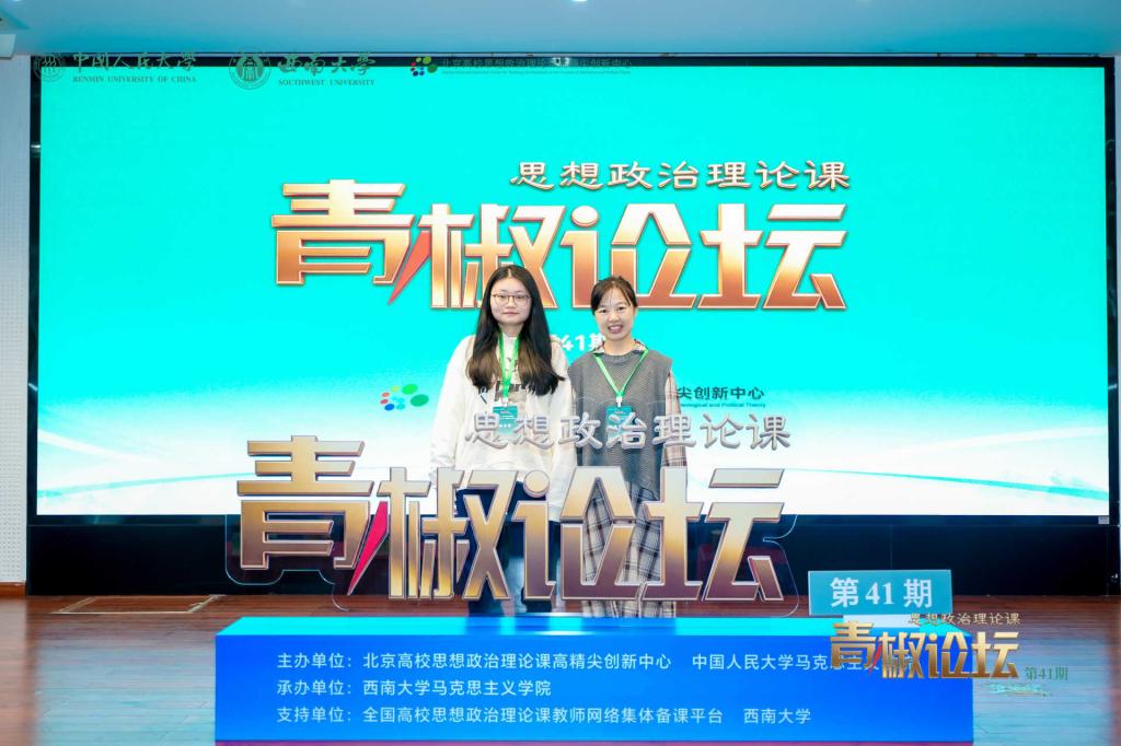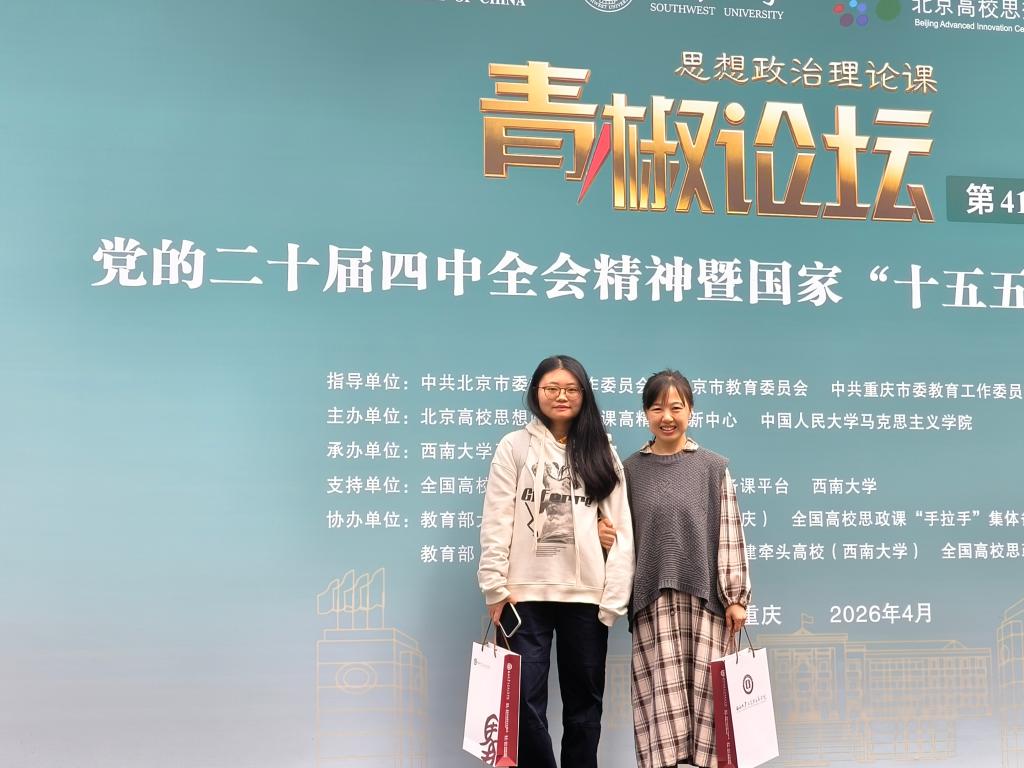 为深入学习贯彻习近平总书记在学校思想政治理论课教师座谈会上的重要讲话精神,全面落实党的二十届四中全会精神和新时代高校思政课建设工作推进会要求,近日,全国思想政治理论课第41期“青椒论坛”在西南大学马克思主义学院成功举办。我院选派2名青年思政课教师成晓静,宋丹萍作为代表参会,与来自全国多所高校的专家学者、思政课教师代表齐聚一堂,共探思政课教学创新路径。