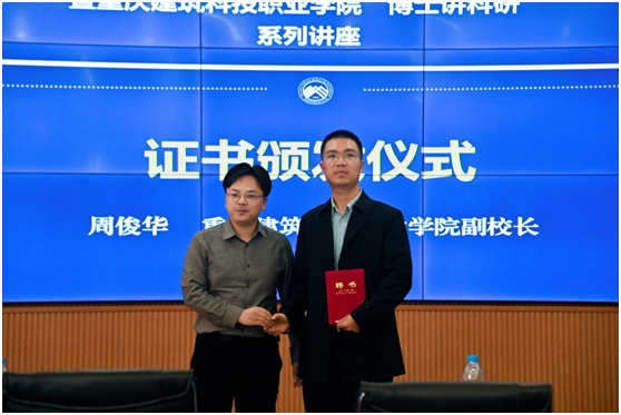 讲座结束后,副校长周俊华教授针对夏亮博士的精彩讲解表示了感谢,并衷心希望两家单位能共同携手研发智能机器人,同时紧密的做好校企合作。最后副校长周俊华教授代表学校给夏亮博士颁发了客座教授证书,希望夏亮博士能时常到学校来讲课,将一线的生产研发经验带到学校来分享。
