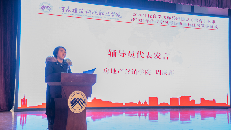 建筑城规学院2020级建筑室内设计1班秦豪同学在发言中说,他代表这15个优良学风建设(培育)标兵班做出慎重承诺:一定谨记这次签字仪式带来的仪式感,严格按建设(培育)标准,一条条对标对表,带领全班同学建设好班级、服务好班级,把“标杆”两个字践行得更加鲜活、更加有说服力、更加有号召力和感染力,请老师放心、领导放心、学校放心!